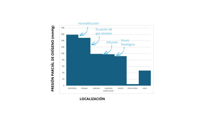 El metabolismo aeróbico es la forma más eficiente que tienen las células para producir energía. El viaje que emprende el oxígeno desde la atmósfera a los tejidos tiene varias etapas que pueden seguirse para identificar las causas de hipoxemia. Estas etapas se llaman la cascada del oxígeno, reflejando que el oxígeno sigue su gradiente, de un ambiente con alta presión parcial (atmósfera), a uno de baja presión parcial (los tejidos) (Figura 1).