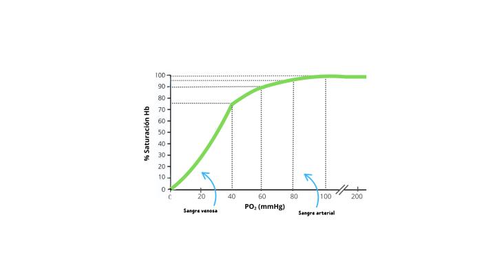 Una vez en la sangre, la mayoría del oxígeno a mayoría se une a la hemoglobina presente en los glóbulos rojos. El resto del oxígeno una vez que la hemoglobina está saturada, viajará disuelto en el plasma. Según la ley de Henry, la cantidad de oxígeno disuelto en el plasma es proporcional a la presión parcial de oxígeno y su coeficiente de solubilidad. Como consecuencia, la saturación de oxígeno de la hemoglobina arterial depende de la presión parcial de oxígeno disuelta (PaO2) en la sangre. Su relación se expresa por la curva de disociación de la oxihemoglobina (Figura 2).