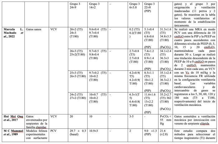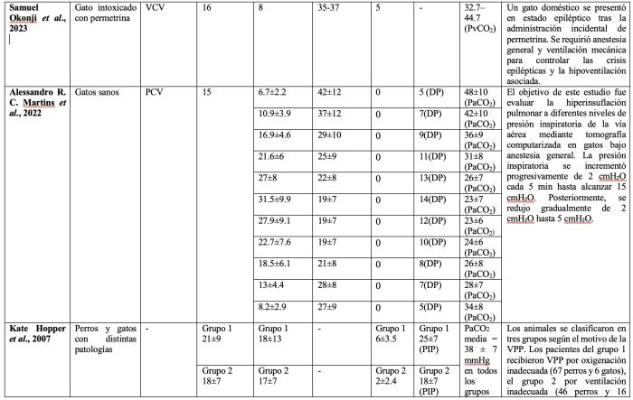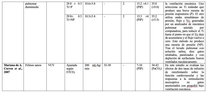 Tabla 2. Mecánica ventilatoria y valores de dióxido de carbono en diferentes estudios donde ventilaron mecánicamente felinos sanos o enfermos. Abreviaturas: ETCO2: Concentración de CO2 al final de la espiración, DP: driving pressure, MRA: maniobra de reclutamiento alveolar, PaCO2: presión arterial de dióxido de carbono; PCV: ventilación controlada por presión, PEEP: presión positiva al final de la espiración; PIP: presión inspiratoria pico, PvCO2: Presión venosa de dióxido de carbono, Vc: volumen corriente, VCV: ventilación controlada por volumen.
