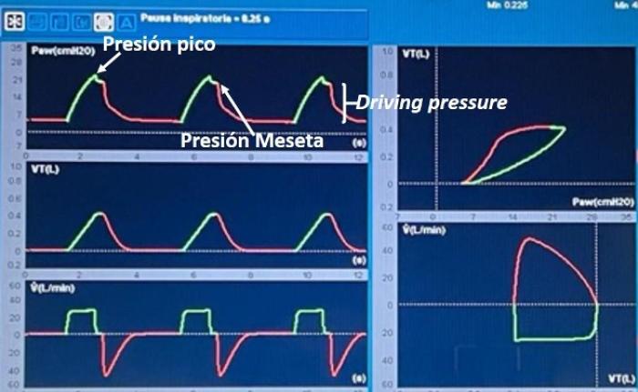 - Presión meseta (plateau): se obtiene mediante la oclusión de la válvula espiratoria, utilizando una pausa inspiratoria de 2 a 3 segundos al final de la inspiración. Durante esta pausa, el manómetro del respirador registra la presión intrapulmonar, que es equivalente a la presión alveolar. Dado que en ese momento no existe flujo aéreo, se elimina el componente resistivo y se evalúa exclusivamente el componente elástico del sistema respiratorio. La presión meseta aumenta cuando disminuye la Csr, pero no se ve influenciada por incrementos en la resistencia de la vía aérea.