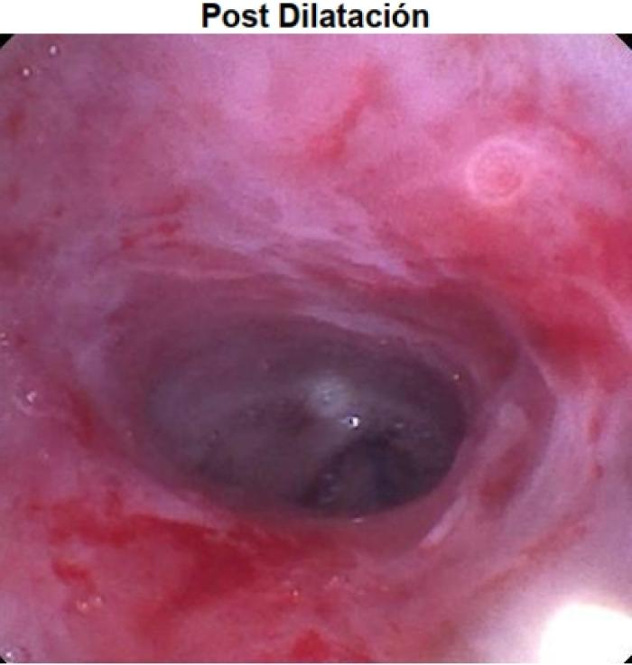 Durante el mismo procedimiento, se realizó la dilatación de la estenosis mediante un balón de 10 mm de diámetro, con cuatro aplicaciones consecutivas durante un minuto cada una (Vídeo 5).