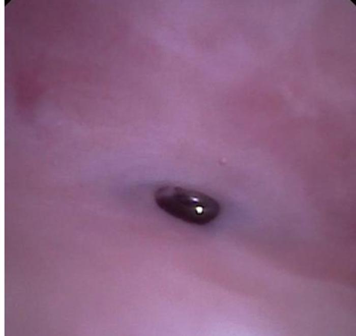 En base a los hallazgos, se planificó y realizó una rinoscopia y nasofaringoscopia retrógrada para confirmar y tratar la alteración, en la que se confirmó la presencia de una estenosis anular fibrosa en la región nasofaríngea media-caudal, con un diámetro luminal estimado de 2 mm, sin identificarse cuerpos extraños ni masas.