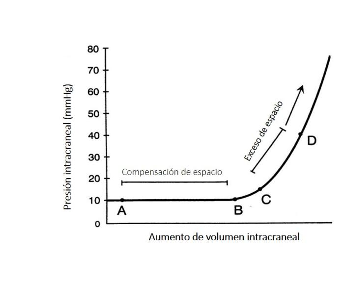 Según la doctrina de Monroe-Kelly, la rigidez del cráneo y el volumen intracraneal fijo implican que cualquier incremento en tejidos, sangre o LCR puede traducirse en elevación de la PIC1, 2 Los mecanismos compensatorios (redistribución de LCR, salida venosa, etc.) amortiguan cambios pequeños, pero al superarse estos mecanismos, la PIC aumentará de forma exponencial con mínima variación de volumen (Figura 1).