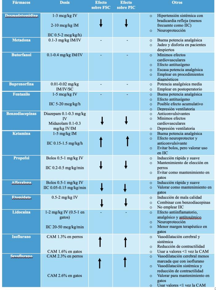 - Opioides: Ayudan a suprimir respuestas hemodinámicas al dolor y nocicepción y no tienen efecto demostrado sobre la PIC12. Sin embargo, pueden causar depresión ventilatoria, y por ello aumento de la PaCO₂, y también náuseas y vómitos, lo que aumentaría la PIC12, 13. Aunque no está demostrado en medicina veterinaria, en humana se cree que pueden atravesar la BHE, alterar el estado mental y enlentecer la recuperación de estos pacientes14.Los más utilizados en veterinaria son butorfanol (para procedimientos diagnósticos y no dolorosos), metadona y fentanilo (para procedimientos dolorosos).