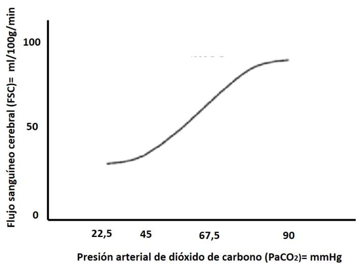 - Presión arterial de dióxido de carbono (PaCO₂): La PaCO₂ regula el tono vasomotor cerebral: la hipercapnia aumenta el FSC y la PIC mientras que la hipocapnia produce vasoconstricción y reducción rápida de la PIC. En estos pacientes se recomienda la reducción temporal de PaCO₂ a ≈30 mmHg para disminuir la PIC de forma rápida, limitando la hipocapnia prolongada por riesgo de isquemia cerebral2, 3 (Figura 4).