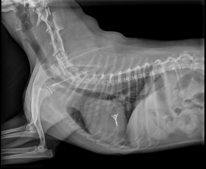 A la semana de intervención el paciente se presentó en consulta para revisión de ecocardiografía y los parámetros obtenidos mostraron una mejoría de la clasificación ACVIM pasando a fase B2, con un índice MINE de 5 puntos, mejorando a un grado leve (ver Tabla 1). En ese momento el tutor comentó que presentaba un estado general correcto, había presentado vómitos aislados y tenía un ligero seroma en el área de intervención. Se realizó hemograma el cual mostró una leve leucocitosis y el análisis bioquímico descartó aumento en los valores de urea y creatinina. El estudio radiográfico en ese momento evidenció reducción significativa del atrio izquierdo, con ausencia de signos compatibles con congestión pulmonar (Figura 3). En consecuencia, se optó por modificación del tratamiento ambulatorio y reducción de la dosis de Furosemida (1mg/kg BID) y continuar con misma dosis de Pimobendán (0.25mg/kg BID) de manera crónica hasta la siguiente visita al cabo de un mes.