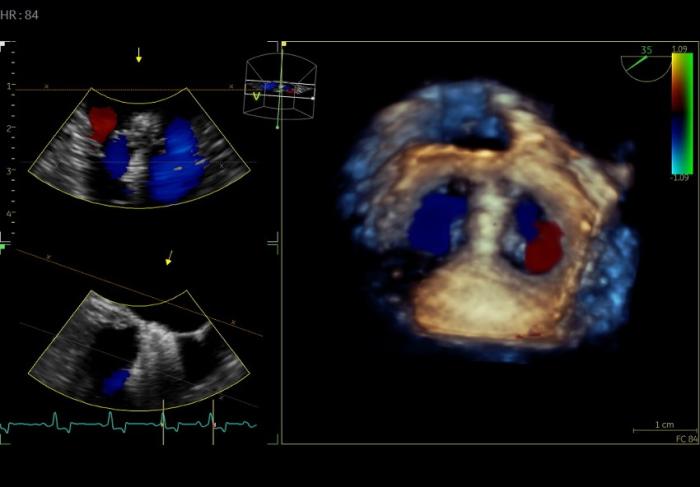 Se realizó la punción transapical ecoguiada y posterior intercambio a introductor de 14 French. Se introdujo un catéter introductor vascular de 6Fr que permitió colocar un dispositivo de nitinol con el extremo distal de forma esférica para poder avanzar el catéter de 14Fr hasta el atrio izquierdo. Se retiró el catéter guía y el catéter de 6Fr y se introdujo el dispositivo V-Clamp con su primera apertura en posición atrial y segunda en posición ventricular. Tras confirmación mediante TEE-3D y estudio Doppler color de la correcta posición de dispositivo en la zona central de la válvula mitral, se procedió al cierre, toma de medidas de seguridad pre-liberación y liberación del mismo. Finalmente, una vez liberado el dispositivo se confirmó la correcta posición, con una reducción intraquirúrgica de la RM de 78 %, calculada en base al porcentaje del volumen regurgitante en el atrio izquierdo (Figura 2).