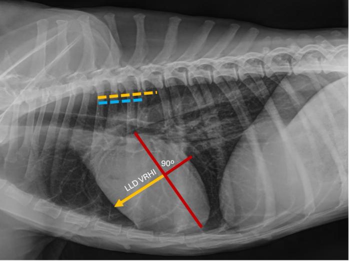 Representación de la determinación del índice cardíaco vertebral derecho (VRHi) en proyección latero-lateral derecha (LLD) en un perro parasitado por Dirofilaria immitis y que sufría de hipertensión pulmonar. Valor de 3,9 cuerpos vertebrales al trasladar la determinación sobre las vértebras torácicas comenzando en el borde craneal de la cuarta vértebra torácica (línea de color naranja).