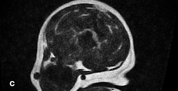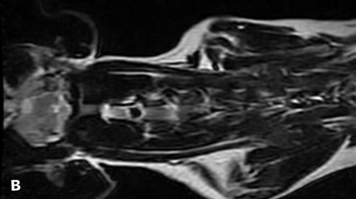Figura 1. Resonancia magnética cervical donde se observa la severidad de la compresión medular por la extrusión discal C2-C3. (A) Corte sagital en T2. (B) Corte coronal en T2. (C) Corte axial en T2.