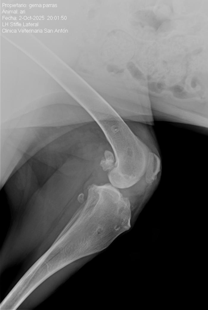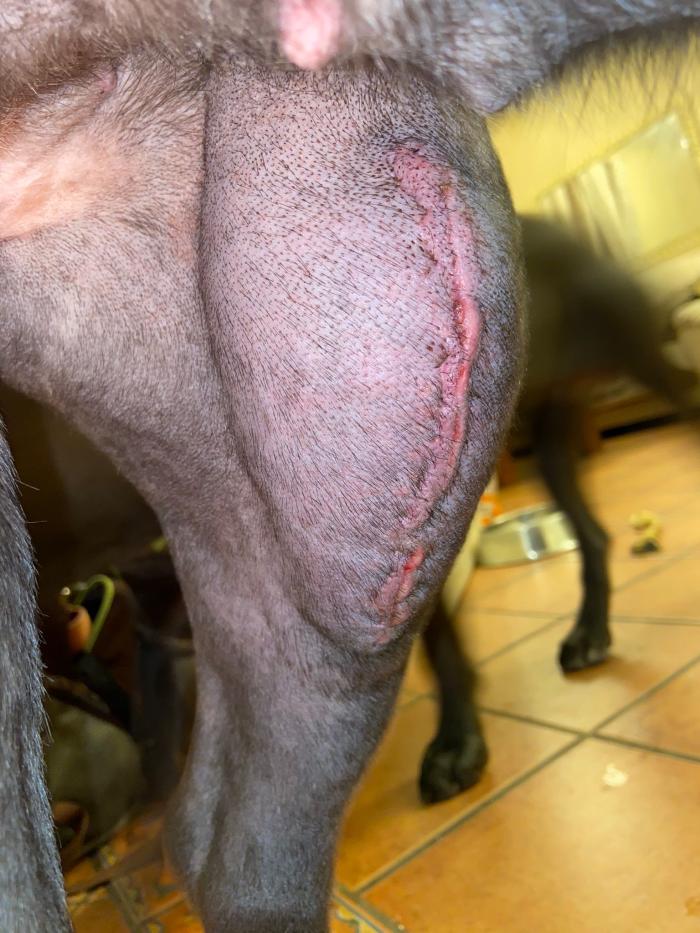 - 4 infecciones posquirúrgicas, por mordedura y apertura de la incisión por parte del propio paciente que motiva a pesar de la antibioterapia que alrededor de 1 a 2 meses postquirúrgico requiera retirar el implante, y estabilización con extracapsular. Una de ellas adquiere una infección severa aislándose E. coli y Stafilococus spudointermedius, requiriendo también retirar el implante extracapsular, estabilizándose la articulación debido a la fibrosis, pero sin duda el caso más severo (raza Weimaraner) (Figuras 6-10).