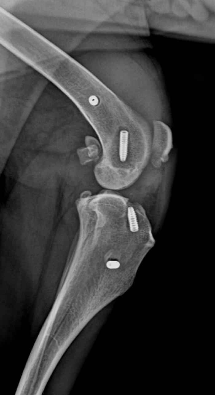 En la mayoría de los casos aparece inflamación en la rodilla, algún caso con seroma leve, y en un 30 % de los casos edema en tarso los 2 a 6 días posquirúrgicos (Figura 4).