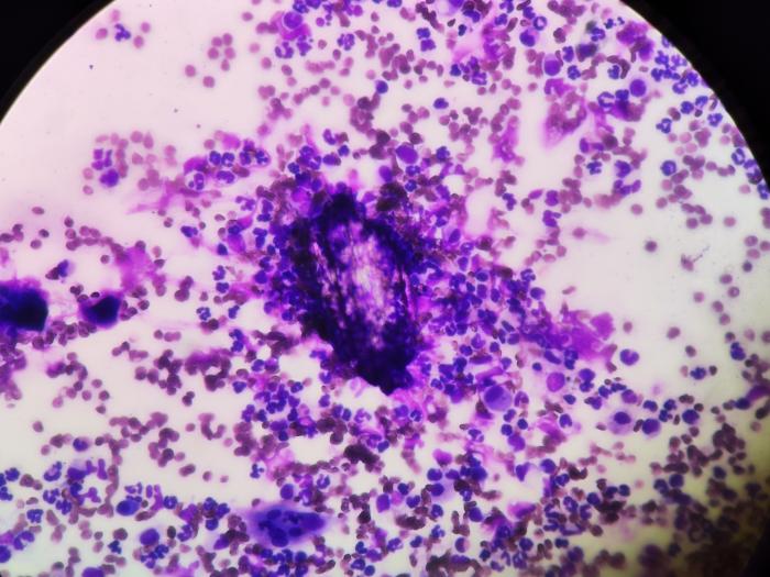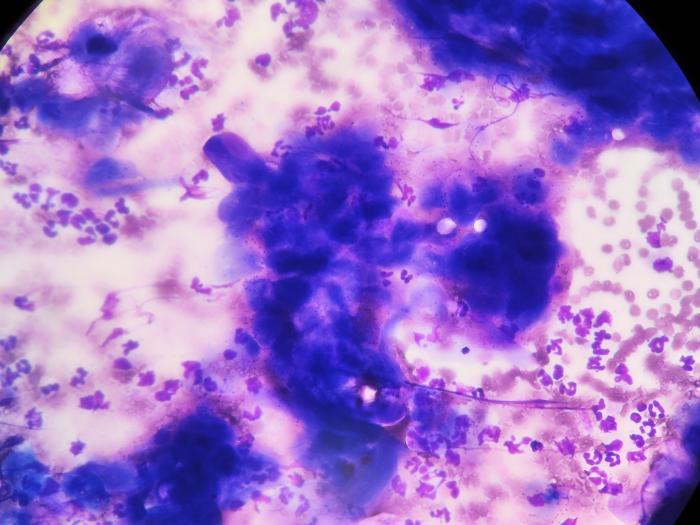 En la citología se pueden observar células gigantes multinucleadas, macrófagos, neutrófilos, células macrófagos epitelioides y material granular basófilo, como se observó en este caso9.