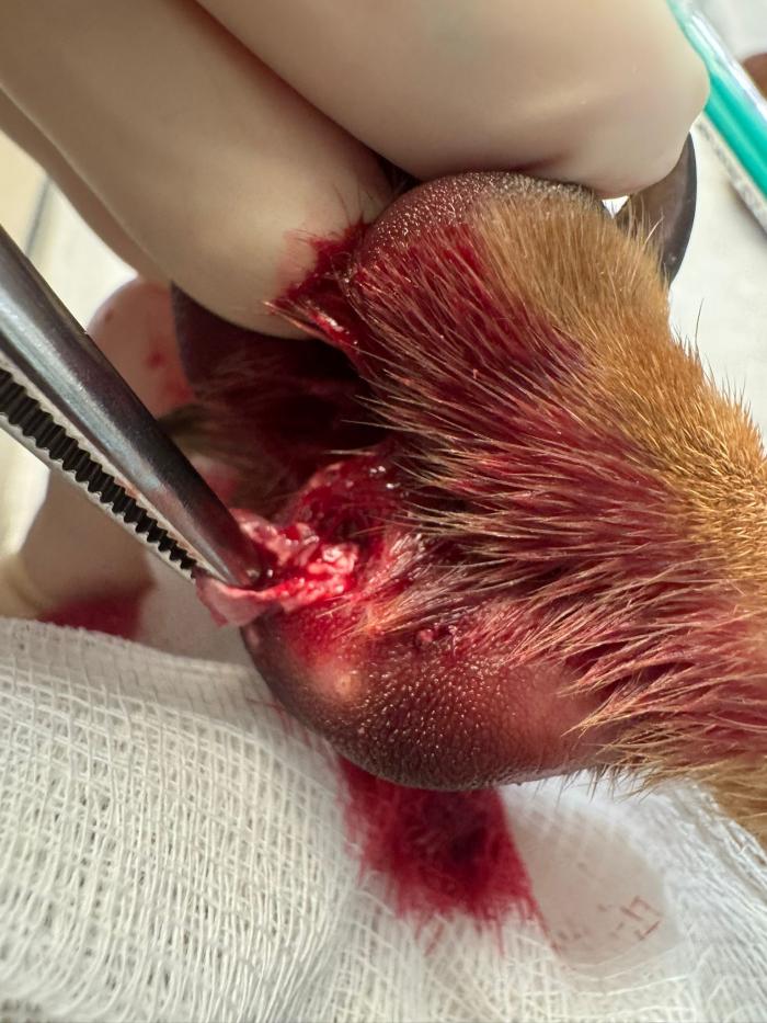 Se presentó en consulta una cachorra de especie canina, raza Teckel, hembra entera de 6 meses de edad, con cojera leve-moderada de la extremidad anterior izquierda. El historial incluía tratamientos tópicos previos con pomadas de glucocorticoides y antibióticos así como cicatrizantes a base de centella asiática, sin mejoría clínica. A la exploración física general no se observaron alteraciones sistémicas, pero sí dolor a la palpación de la almohadilla palmar.
