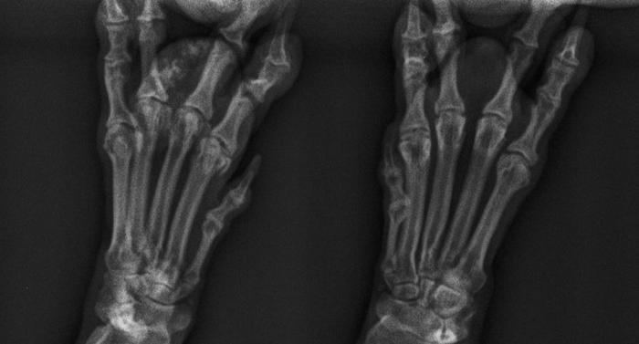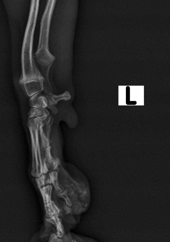 Las radiografías latero-laterales y dorso-ventrales de las extremidades anteriores mostraron material amorfo radiodenso localizado en la almohadilla afectada (Figuras2 y 3). Se realizó citología PAF (Punción con Aguja Fina), analítica sanguínea y biopsia de la zona. El análisis hematológico evidenció hiperfosfatemia leve, sin alteraciones en calcio, función renal o hepática.
