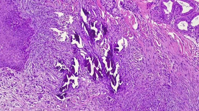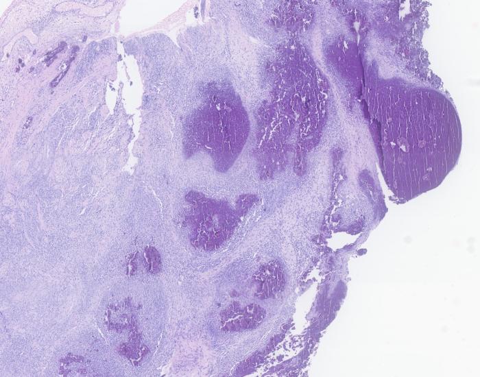 Histológicamente, la CC se caracteriza por la presencia de material basofílico amorfo o granular, rodeado de reacción inflamatoria granulomatosa con macrófagos espumosos y células gigantes multinucleadas, a menudo encapsulado por tejido conectivo fibroso7,12-14.