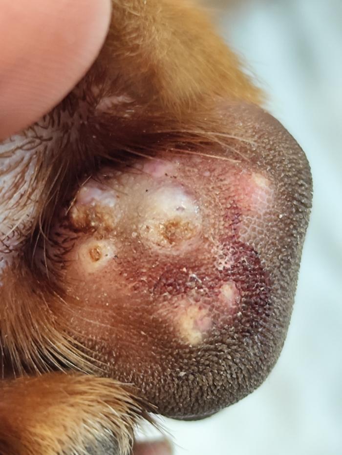 En la inspección dermatológica se observaron lesiones crateriformes, blanquecinas, de tamaño variable, en la superficie de la almohadilla palmar de la extremidad anterior izquierda (Figura 1).