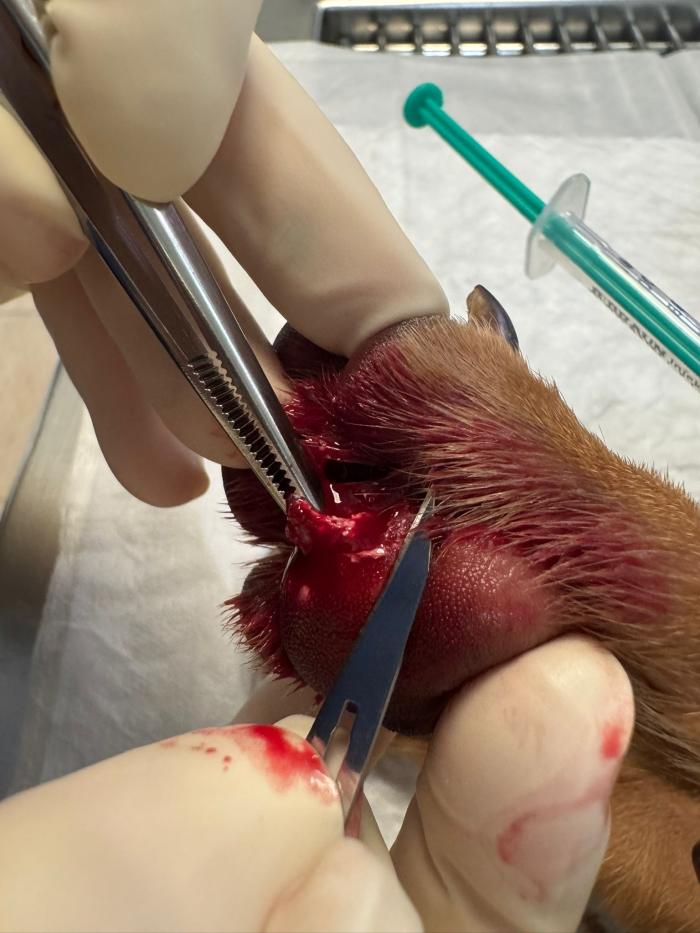 Tras la extracción de los depósitos cálcicos durante la toma de biopsia (Figuras 8 y 9), la paciente evolucionó favorablemente, con resolución completa de la cojera y ausencia de recidiva en los controles posteriores. Actualmente, la paciente se encuentra sana.
