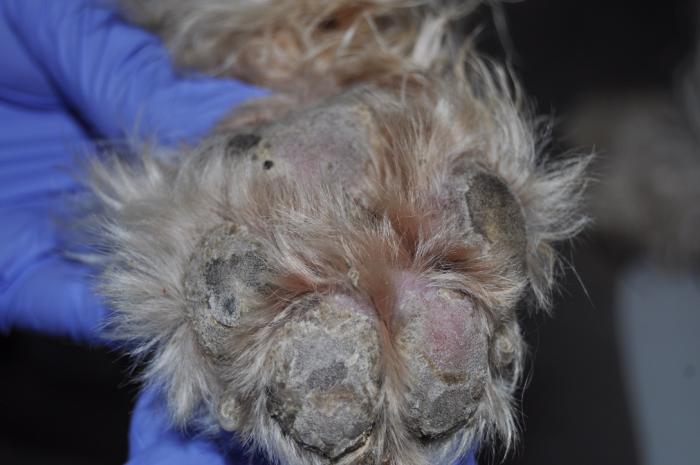 - Menos probables serían las causas habituales de una foliculitis (dermatofitosis, foliculitis bacteriana y sarna demodécica) asociadas a otras causas que justificasen las lesiones plantares y la otitis externa.