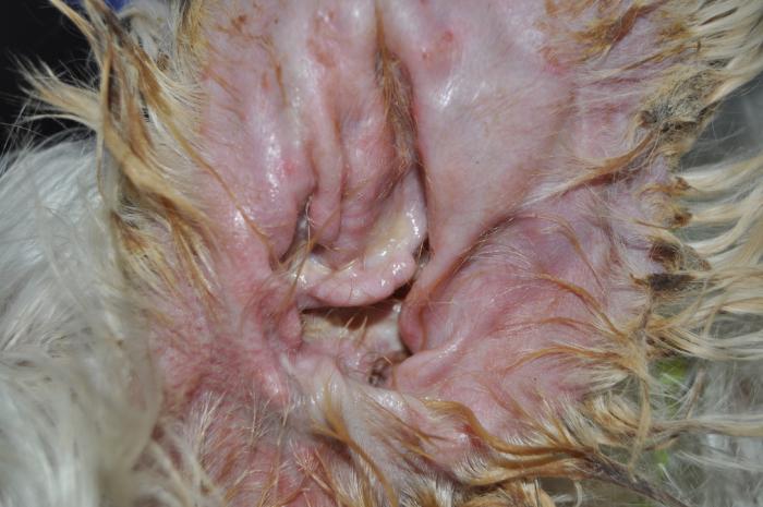 Además, había hiperqueratosis, úlceras y costras en las almohadillas plantares de las 4 extremidades (Figura5) y tenía inflamación eritematosa y exudativa en la cara interna de ambos pabellones auriculares (Figura 6A-B) y en la entrada de los conductos auditivos.