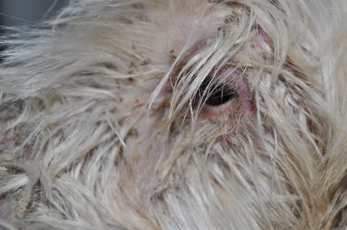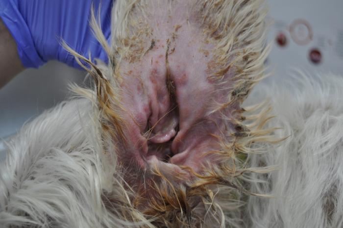 El motivo de consulta era la presencia de prurito y múltiples lesiones costrosas que no respondían al tratamiento. Según la tutora, el cuadro había empeorado tras tener el celo un mes y medio antes. En el momento de la consulta la perra estaba tomando amoxicilina-ácido clavulánico 500/125 mg cada 12h vía oral desde hacía 3 semanas y le limpiaban ambos conductos auditivos con una loción auricular (Epiotic®) cada 72 h.