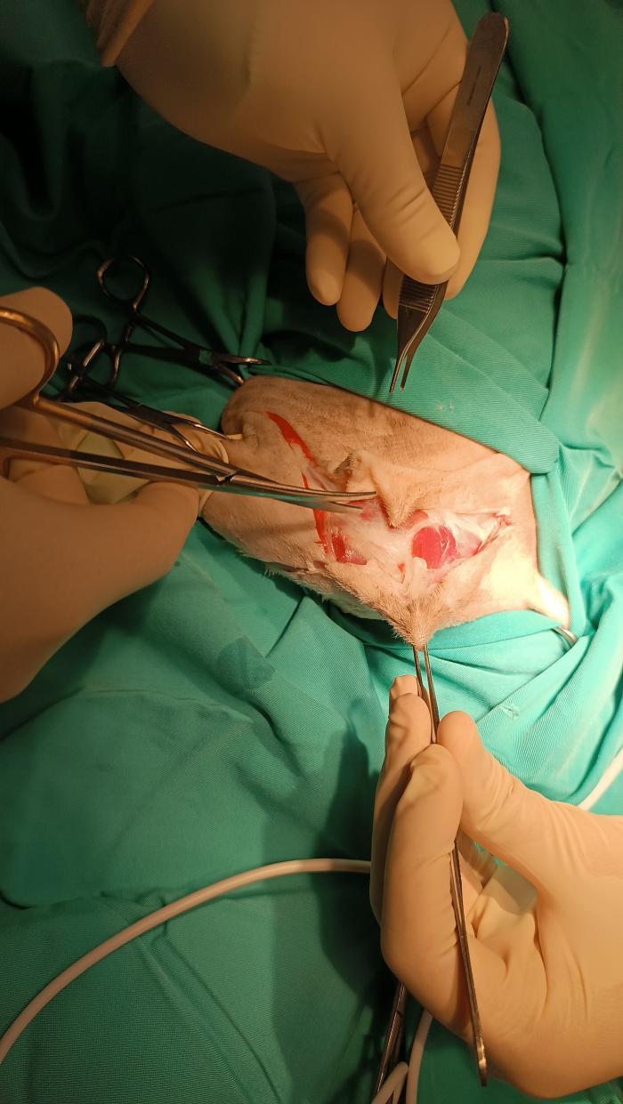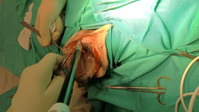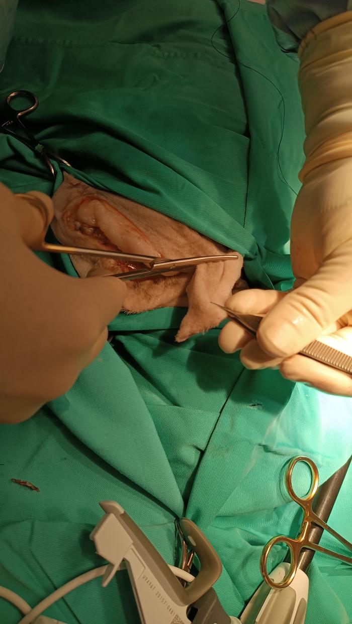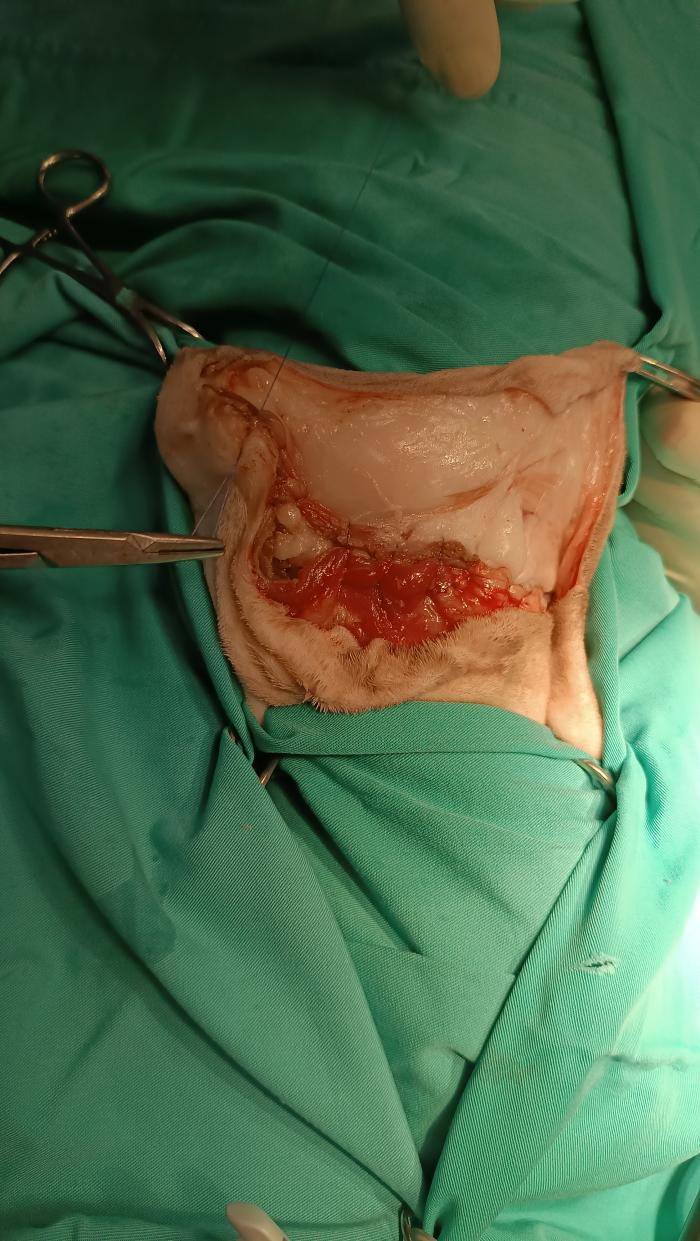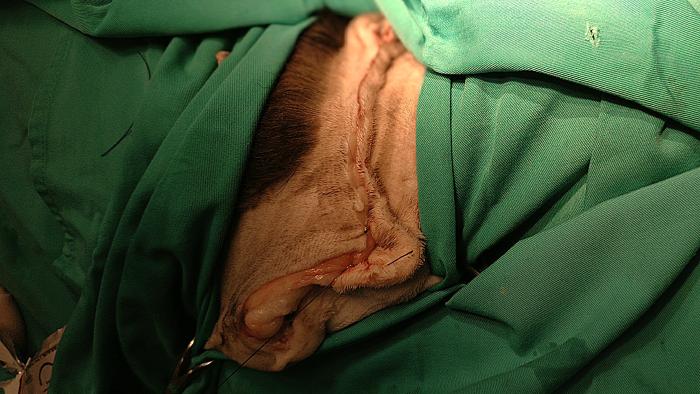 Finalmente, la piel se cerró con grapas consiguiendo un aspecto final de T invertida, siendo uno de los lados de la T de inferior tamaño para evitar el exceso de piel (Figura17).