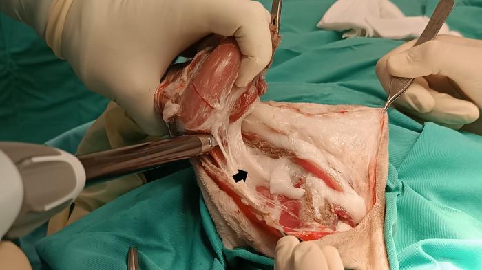 Posteriormente se aplicó tracción lateral en la escápula para exponer los músculos romboides y serrato ventral y seccionarlos del borde dorsal y medial de la escápula respectivamente con bisturí bipolar (Figura 10).