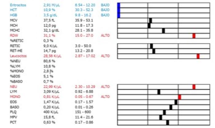 Se realizaron pruebas laboratoriales y los resultados determinaron un hematocrito de 10,9%, con un valor de eritrocitos de 2,91 M/μL y de hemoglobina de 3,5 g/dL. Los leucocitos estaban en 28,56 K/μL, con los neutrófilos en 22,99 K/μL y los monocitos en 0,81 K/μL (Figura4).