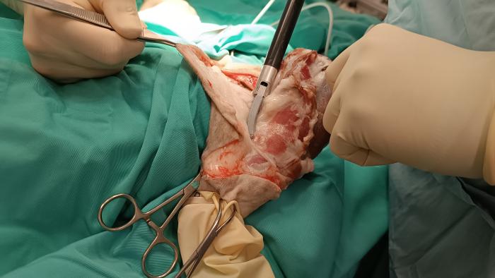 A continuación, se seccionaron el músculo trapecio de su inserción en la espina escapular, tanto en la porción cervical como en la torácica (Figura8), el músculo omotransverso cerca de la espina de la escápula y del acromion y el músculo cleidobraquial en la parte media del vientre mediante el uso de bisturí bipolar (Figura 9), que se utilizó también para realizar hemostasia de la vena omobraquial, cefálica y las ramas de la arteria cervical superficial.