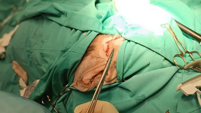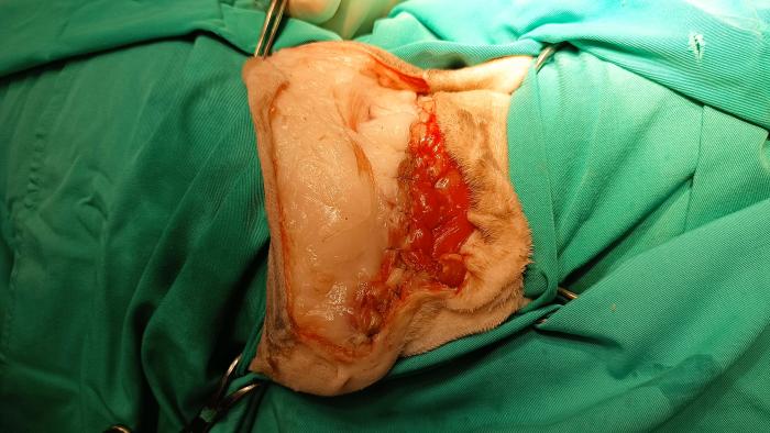 Se tomó como referencia la espina de la escápula, incidiendo la piel longitudinalmente sobre la misma desde el borde dorsal de la escápula hasta el acromion. A continuación, se continuó la incisión circunferencialmente alrededor de la extremidad torácica cranealmente a nivel del tubérculo mayor del húmero y caudalmente en la zona del pliegue axilar hasta unirla a la incisión lateral a nivel del acromion (Figura 5) evitando la realización de un colgajo de piel puntiagudo en el punto en el que confluyen las incisiones para evitar la necrosis avascular de la piel. El plano subcutáneo se disecó con una combinación de disección cortante y roma, realizando hemostasia con bisturí bipolar (Figuras 6 y 7).