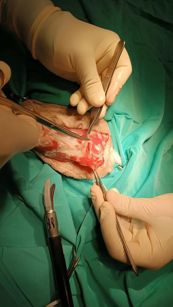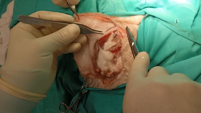 El día de la intervención, tres semanas después de la primera visita, se reevaluó al paciente porque su estado general había empeorado. Los propietarios comentaron que la herida sangraba mucho y que lo notaban más apático. Se detectó una pérdida de peso del 5%, a pesar de mantener el apetito, falta de acicalamiento y mucosas pálidas. La lesión mostraba signos de infección y mal olor (Figura 3).
