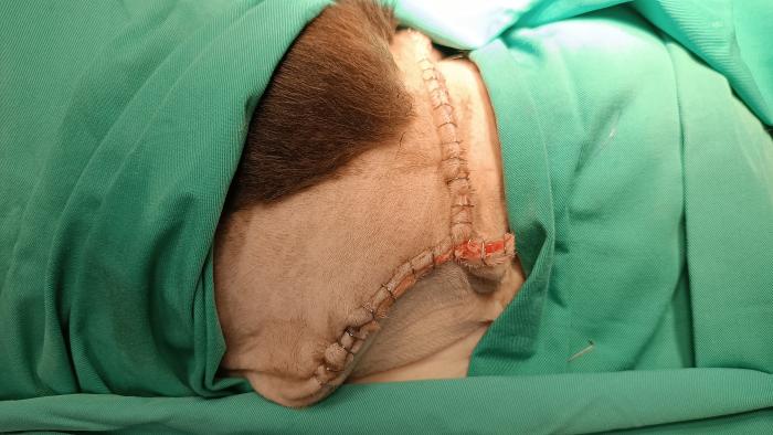 La evolución fue buena y se dio de alta, continuando con el antibiótico hasta completar una pauta de diez días. Volvió a los 12 días a retirar los puntos. La herida estaba bien cicatrizada, a excepción del área de confluencia de las incisiones que presentaba una pequeña zona de necrosis, por lo que se recomendó seguir haciendo las curas hasta su completa curación.