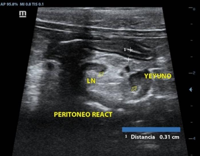Química sanguínea: urea disminuida (5.6 mmol/l),los demás analitos dentro de rangos normales, hemograma sin alteraciones. Ultrasonido abdominal con ayuno de 8 h en el cual se observó estómago con presencia de gas, engrosamiento de segmentos duodenal (0.39 cm) (Figura10)y yeyunal (0.30-0.31 cm), el yeyuno con pérdida de definición de capas, así como la presencia de linfonodos yeyunales reactivos, con grasa perinodal hiperecoica y peritoneo reactivo adyacente al yeyuno (Figura11),vesícula biliar con presencia de sedimento biliar en cantidad moderada.