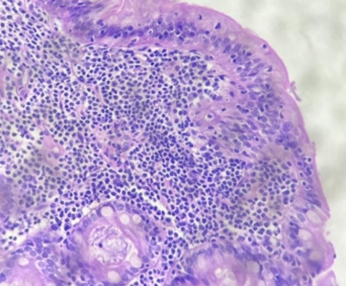 Diagnóstico histopatológico: infiltración linfocítica atípica de origen a determinar (Figura 14). Por el nivel de epiteliotropismo e infiltración, se recomienda realizar inmunotipificación de íleon con CD3, CD8, CD79 & CD20 para aumentar la especificidad diagnóstica; pudiendo corresponder tanto a un proceso inflamatorio crónico, o bien, a uno neoplásico inicial/de bajo grado.