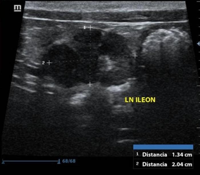 en urianálisis presentó una DU de 1.038, presencia de sangre secundario a la toma de muestras y proteinuria relacionada. Presión arterial promedio de 152/92, considerado como pre hipertensión, perfil tiroideo sin alteraciones y en ultrasonido abdominal se observa engrosamiento del segmento intestinal del duodeno (0.30 cm), yeyuno en mediciones normales y engrosamiento del íleon (0.39 cm) con pérdida de la estratificación normal, presencia de linfonodos iliacos reactivos y presencia de sedimento en el lumen de la vesícula biliar (Figuras 2 y 3). El coproparasitoscópico directo fue negativo y la tinción kinyoun fue positiva aCryptosporidium.