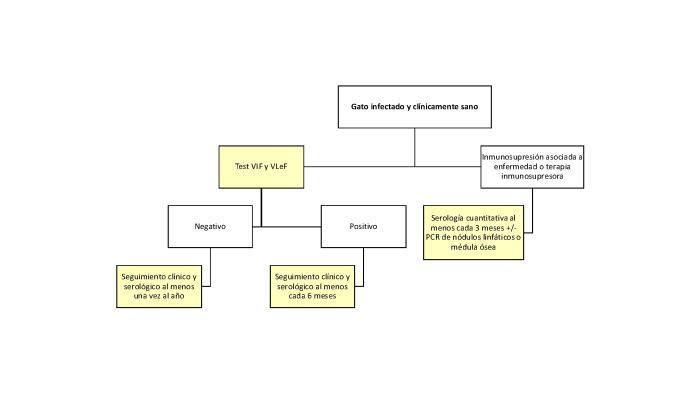 En gatos infectados, pero clínicamente sanos, es decir, positivos a serología o PCR sin signos clínicos ni alteraciones clinicopatológicas, no se recomienda tratamiento específico, aunque sí un seguimiento estrecho4,9,12 (Figura 3). Estos animales pueden presentar coinfecciones, por ejemplo, con retrovirus, por lo que se recomienda la realización de pruebas para ambas infecciones6,9. En gatos negativos a VIF y virus de la leucemia felina, se aconseja control serológico anual, mientras que en positivos debe realizarse un seguimiento clínico y serológico al menossemestral6,9. En aquellos sometidos a terapias inmunosupresoras o con comorbilidades que afecten al sistema inmune, el control serológico debería realizarse cada tres meses, complementado con PCR en médula ósea o ganglios linfáticos si fuera necesario1,4,9.