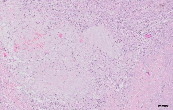 Histopatológicamente, la zona de engrosamiento intestinal se caracterizó por un intenso infiltrado de neutrófilos, macrófagos y, en menor medida, linfocitos y células plasmáticas, que afectaba predominantemente a la mucosa y se extendía al tejido muscular y mesenterio adyacente. Este proceso inflamatorio se acompañaba de hemorragia abundante y leve reacción de fibroplasia. Multifocalmente, se observaron pequeños agregados de macrófagos espumosos y ocasionales células gigantes multinucleadas dispuestos alrededor de espacios de contenido eosinofílico anfofílico pálido, correspondientes a vasos linfáticos dilatados bordeados por una fibroplasia concéntrica leve. Lesiones similares se identificaron también en la submucosa de las zonas marginales, no pudiéndose descartar, por lo tanto, la afectación de otros segmentos intestinales. La mucosa restante mostró hiperplasia moderada del tejido linfoide asociado a mucosa y un infiltrado inflamatorio mixto, compuesto por un número moderado de neutrófilos, linfocitos y células plasmáticas. Estos hallazgos fueron consistentes con linfangitis lipogranulomatosa focal grave (Figura 3A-D).