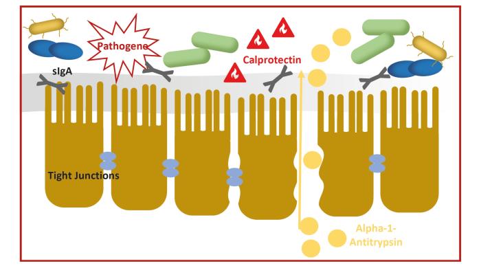La α1-antitripsina (α1-AT) es una proteína perteneciente a la familia de los inhibidores de serina proteasa (serpinas). Se sintetiza principalmente en el hígado y circula en el plasma sanguíneo a concentraciones relativamente estables. Su función fisiológica es inhibir las enzimas proteolíticas, en particular la elastasa de neutrófilos, para prevenir el daño tisular causado por respuestas inflamatorias excesivas. La α1-AT tiene especial relevancia diagnóstica en casos de enteropatía perdedora de proteínas (EPP). A diferencia de muchas otras proteínas, la α1-AT es en gran medida resistente a la degradación enzimática dentro del tracto gastrointestinal. Cuando la función de barrera intestinal se ve comprometida —por ejemplo, debido a inflamación o ulceración— la α1-AT puede filtrarse del plasma a la luz intestinal y detectarse intacta en las heces. Esto convierte a la α1-AT en un marcador fecal ideal para identificar la pérdida de proteínas plasmáticas a través del tracto gastrointestinal. Su detección en las heces indica una alteración de la integridad de la barrera intestinal y se considera un marcador de pérdida de proteínas intestinales.
