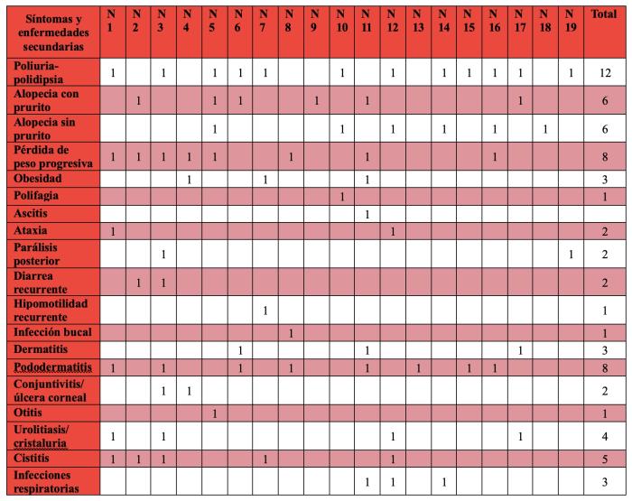 Sin embargo, en los casos con prurito se observó que aproximadamente la mitad estaban asociados a dermatitis infecciosas secundarias. Al excluir estos casos, se evidencia que las alopecias no pruriginosas fueron más frecuentes, representando el 31.58 % de los casos, en comparación con las alopecias pruriginosas, que correspondieron al 15.79 %. En cuanto al peso, al contrario de lo que ocurre en perros, que en la mayoría de casos se aprecia obesidad, en este estudio se aprecia que solo el 15.79 % de los casos presentaban esta condición. Por el contrario, el 42.11 % de los animales presentaba una bajada progresiva de peso. Entre los procesos inflamatorios-infecciosos secundarios más comunes en estos animales destaca la pododermatitis, en muchas ocasiones severa, la cual se observa en un 42.11 % de los casos, seguida por la cistitis en un 26.32 % de los casos. Posteriormente las dermatitis e infecciones respiratorias se aprecian en el 15.79 % de los casos; en menor medida se encuentran las conjuntivitis y úlceras corneales en un 10.53 % de los pacientes y finalmente las otitis y estomatitis e infecciones dentales, observados en un 5.26 % de los animales. Otra enfermedad secundaria que se aprecia en un número reseñable de casos es la cristaluria o cálculos urinarios de calcio asociado a un 21.05 % de los casos. Las patologías digestivas eran menos comunes, pero se han observado diarreas recurrentes en el 10.53 % de los animales y aún menos frecuente los casos de estasis que eran solo el 5.26 %. Otros síntomas que se han apreciado son manifestaciones neurológicas con ataxia y parálisis posterior en un 10.53 % de los casos cada una. Finalmente se ha apreciado en baja proporción síntomas como ascitis y polifagia en un 5.26 % de los animales cada uno.