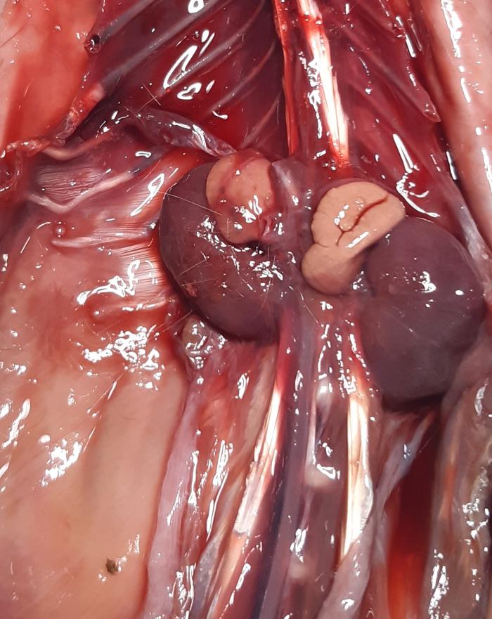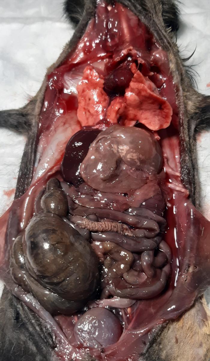 Son pocos los autores que hablan de daño renal asociado. Sin embargo, este sí fue observado en el presente estudio, con aumentos en electrolitos como el magnesio y valores menores a 1010 en la densidad urinaria. En el caso de Nowotny I., sus animales presentaban signos de fallo renal, pero las densidades urinarias se encontraban entre 1012 y 103310. Solo en un artículo que describe un caso clínico se observó un urolito de carbonato cálcico obstruyendo un uréter, lo cual también ha sido observado por el equipo en varios casos, de forma recurrente en algunos. Esto también se considera importante a la hora de tener esta patología en cuenta en el diagnóstico diferencial, sobre todo si la dieta del animal es correcta y sin excesos de calcio o vitamina D. En estos casos es probable que se encuentren hallazgos de hipercalcemia, pero también se ha visto en animales con daño renal secundario al hiperadrenocorticismo. En un caso, además, se evidenciaron calcificaciones ectópicas en órganos digestivos durante la necropsia (ver Figura 3)9.