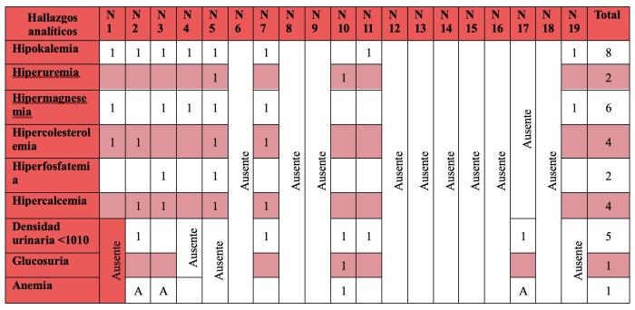 Analizando los animales con pruebas bioquímicas (Tabla 3), se puede observar que un 88.88 % de los animales presentaban hipokalemia, la cual en muchos casos se encontraba en valores inferiores a 5 y en ocasiones se asociaban con la aparición de ataxia y parálisis posterior. La hipercolesterolemia, también asociada con esta enfermedad en otras especies, se observó en el 44.44 % de los casos siendo igual que la hipercalcemia, la cual no se asocia con esta enfermedad en otras especies. En cuanto a los parámetros que se pueden relacionar con daño renal secundario, la hipermagnesemia fue el hallazgo más frecuente, presente en un 66.66 % de los pacientes, seguido por la hiperfosfatemia y la hiperuricemia, ambas detectadas en el 22.22 % de los casos. En ningún paciente con hiperuricemia se observó un aumento concomitante de creatinina. En comparación con los perros cabe destacar que no hubo ningún caso con fosfatasa alcalina elevada.