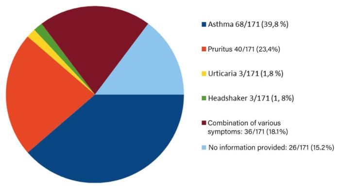 Los caballos incluidos en el estudio exhibieron los siguientes síntomas: asma (n = 68, 39.8 %), prurito (n = 40, 23.4 %), urticaria (n = 3, 1.8 %), sacudidas de cabeza (n = 3, 1.8 %) o una combinación de estos síntomas (n = 31, 18.1 %). En 26 caballos (15.2 %), no se informaron los síntomas específicos (Figura 1).
