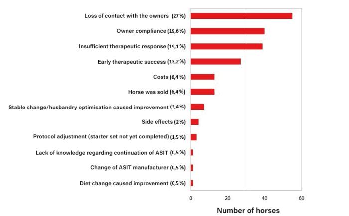 Para determinar las razones de la interrupción de ASIT, se contactó a los veterinarios tratantes mediante cuestionarios escritos. Podían seleccionar una o más razones posibles. Los datos recopilados se analizaron de forma descriptiva.