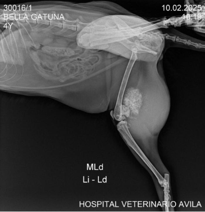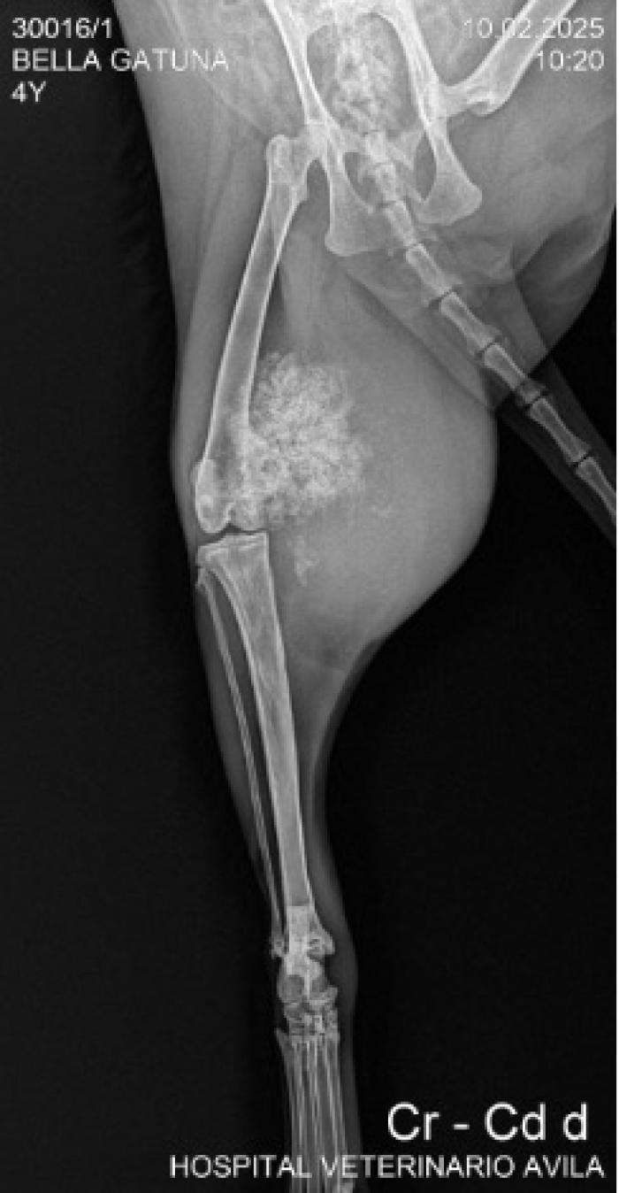 Bella Gatuna, una gata doméstica común europea castrada de 5 años de edad y 4.8 kg, fue llevada a consulta por su propietaria debido a claudicación progresiva grado 2 del miembro pélvico derecho, con una evolución de aproximadamente seis meses posterior a una caída accidental. La paciente había sido tratada previamente con meloxicam y gabapentina sin mejoría clínica evidente.