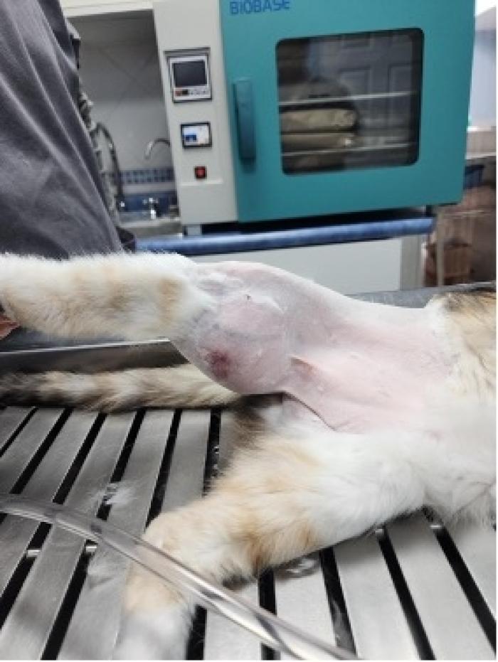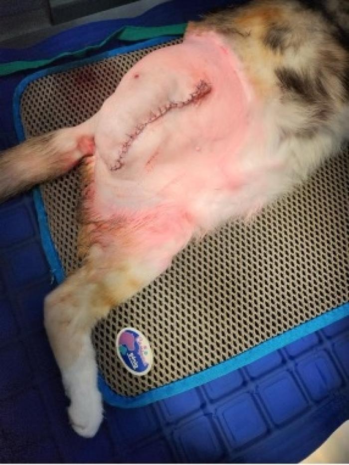 El tratamiento consistió en amputación radical desde la articulación coxo femoral. El procedimiento se realizó sin complicaciones y se indicó manejo postoperatorio con meloxicam (0.1 mg/kg PO cada 24 h) y gabapentina (5 mg/kg PO cada 12 h) durante 10 días. Las suturas se retiraron el día 21 a partir de la fecha de cirugía, observándose una adecuada cicatrización quirúrgica (Figura 5).