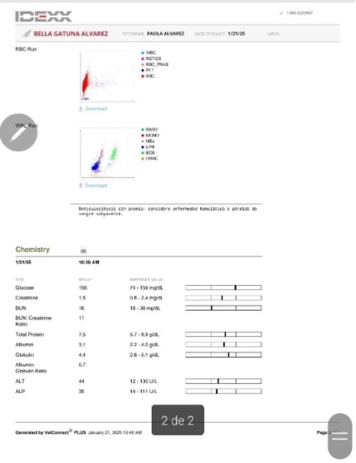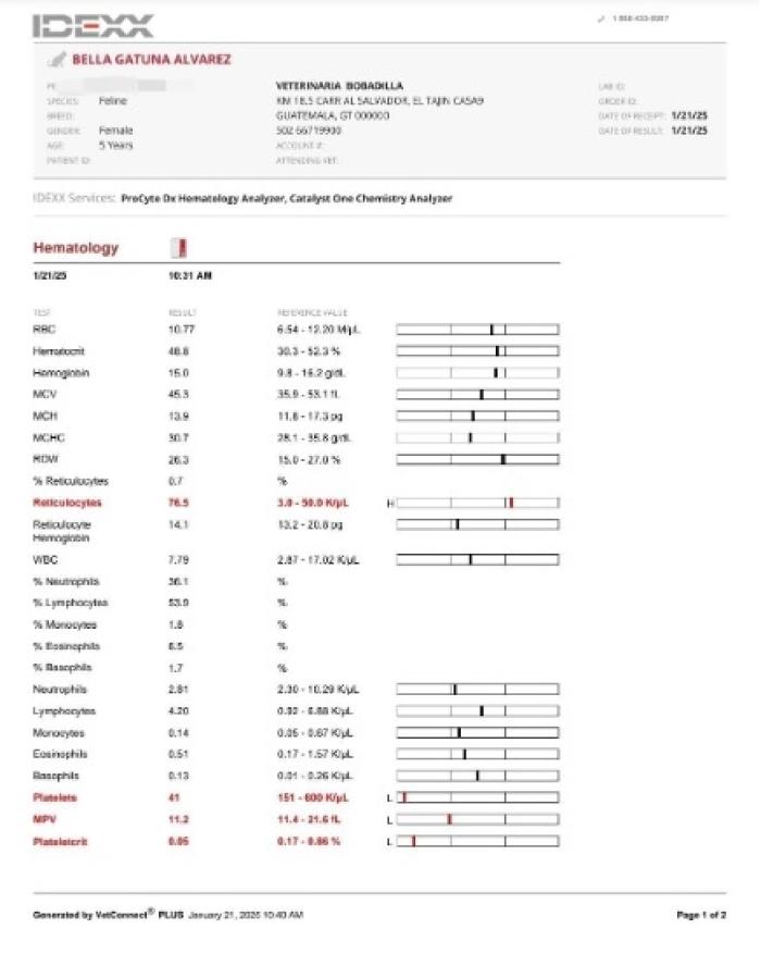 Hemograma sin anormalidades, ligera reticulocitosis sin anemia, trombocitopenia sin signos clínicos (más probable por agregados plaquetarios). No se identificaron alteraciones hepáticas, renales ni electrolíticas significativas (Figura 3 y 4).