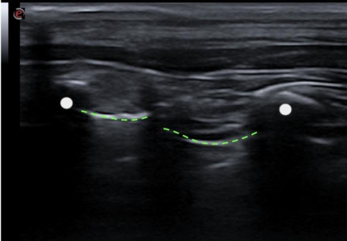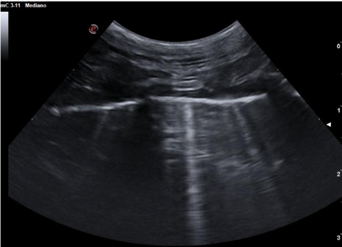 Comenzaremos posicionando el transductor perpendicular a las costillas en uno de los espacios intercostales, pudiendo evaluar al menos el espacio entre dos costillas, la línea PP y no más de 2-3 cm de profundidad de campo (Figura 1A-B).