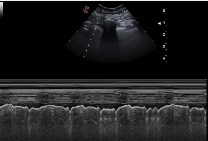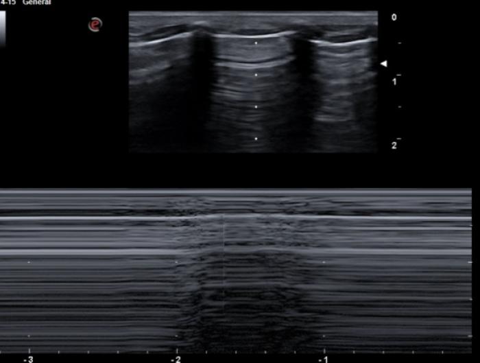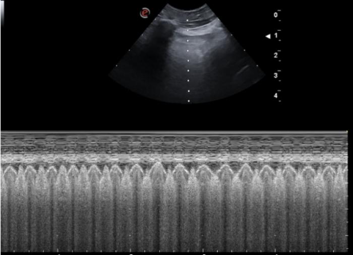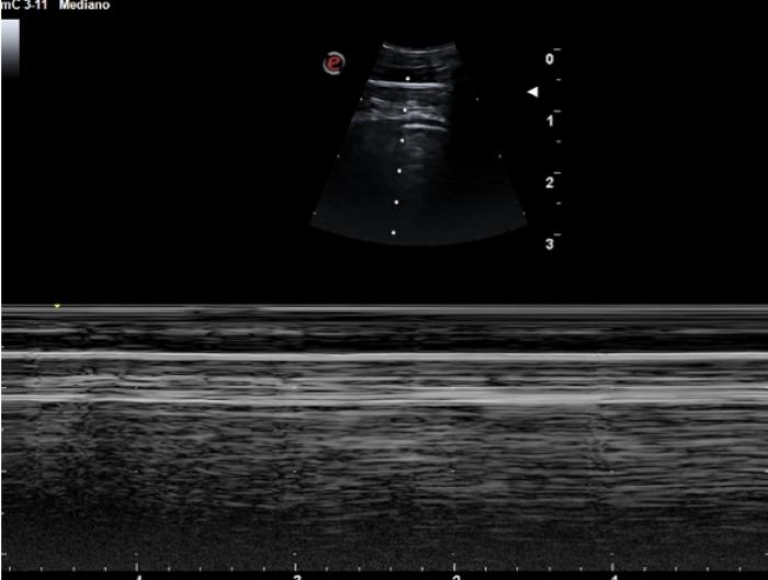 La presencia de pequeñas colecciones de fluido en el espacio pleural no siempre son del todo fáciles de evaluar, especialmente si el contenido en cuestión es lo suficientemente celular como para no visualizarse anecoico. El uso del modo M en estas circunstancias puede ser muy útil. Nos posicionamos con el transductor transversal en el espacio intercostal seleccionado (áreas más declives tienen mayor porcentaje de éxito puesto que el fluido desciende por gravedad), situamos el cursor y activamos el modo M, puesto que el pulmón no está en contacto en todo momento con la pared costal, la LP dibujará un movimiento sinusoidal en el registro en movimiento, muy diferente de la recta hiperecogénica que vemos en el tórax sano (Figura 9A-B).