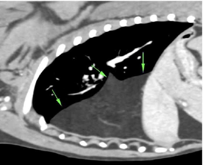 Se describe como una banda hipoecogénica subpleural de unos milímetros de grosor y con una transición dentada con el aire atrapado bajo ella que observaremos como marcadamente hiperecogénico. Frecuentemente se asocia a la torsión lobar (en lóbulos craneales en razas braquicéfalas y en lóbulo medial derecho en pacientes de tórax profundo) y a hemorragias pulmonares como ocurre en neumonías necrotizantes (afectando a más de un lóbulo). Suele ir acompañado de efusión pleural (Figura 14A-B).