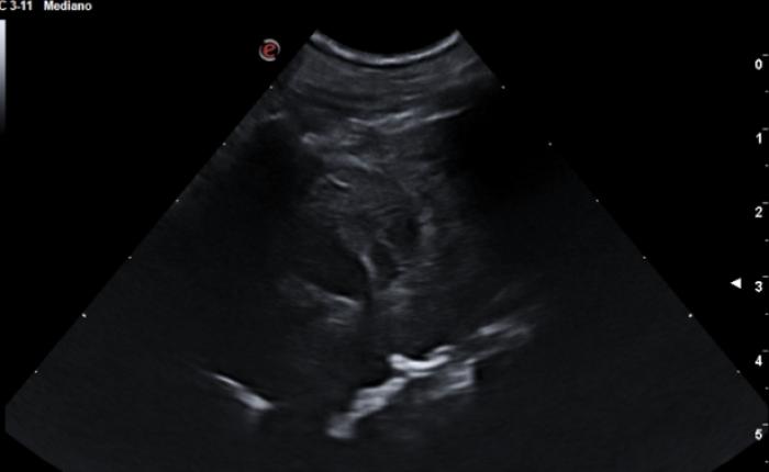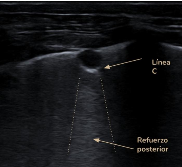 | Signo del cuadrilátero | Espacio anecoico (negro) limitado por costillas y pleuras. | Acumulación de líquido en el espacio pleural. | Derrame Pleural. Localizado inicialmente en zonas dependientes (ventrales). |