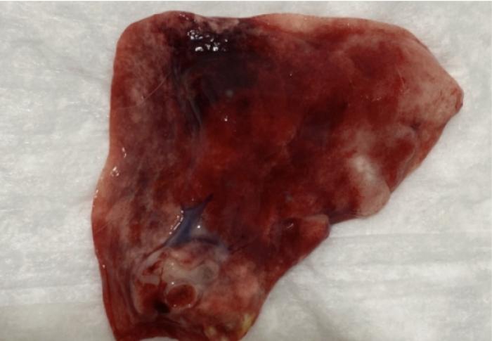 | Signo de fragmentación | Línea pleural irregular, "deshilachada" o con pequeñas roturas. | Consolidaciones subpleurales pequeñas que rompen la interfase. | Fases iniciales de neumonía/contusión. Neumonía bacteriana: áreas ventrales más afectadas, neumonía verminosa multifocal |
